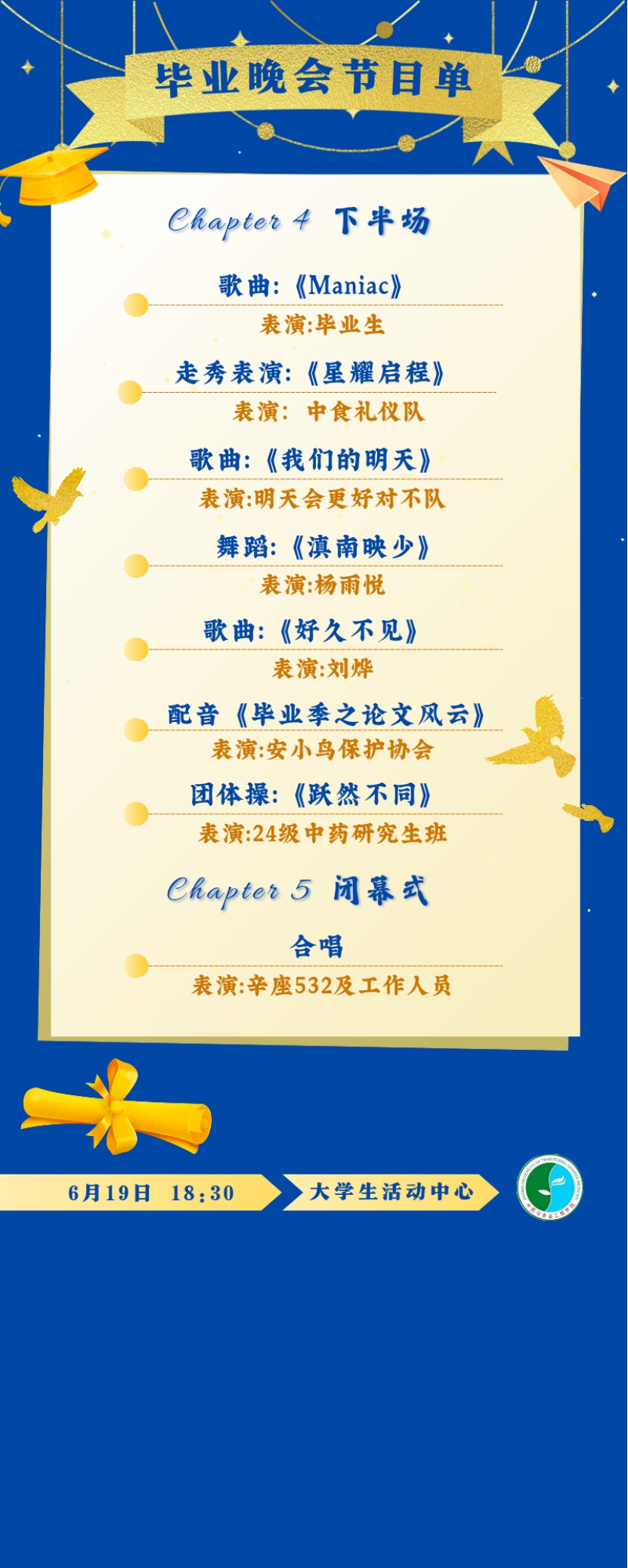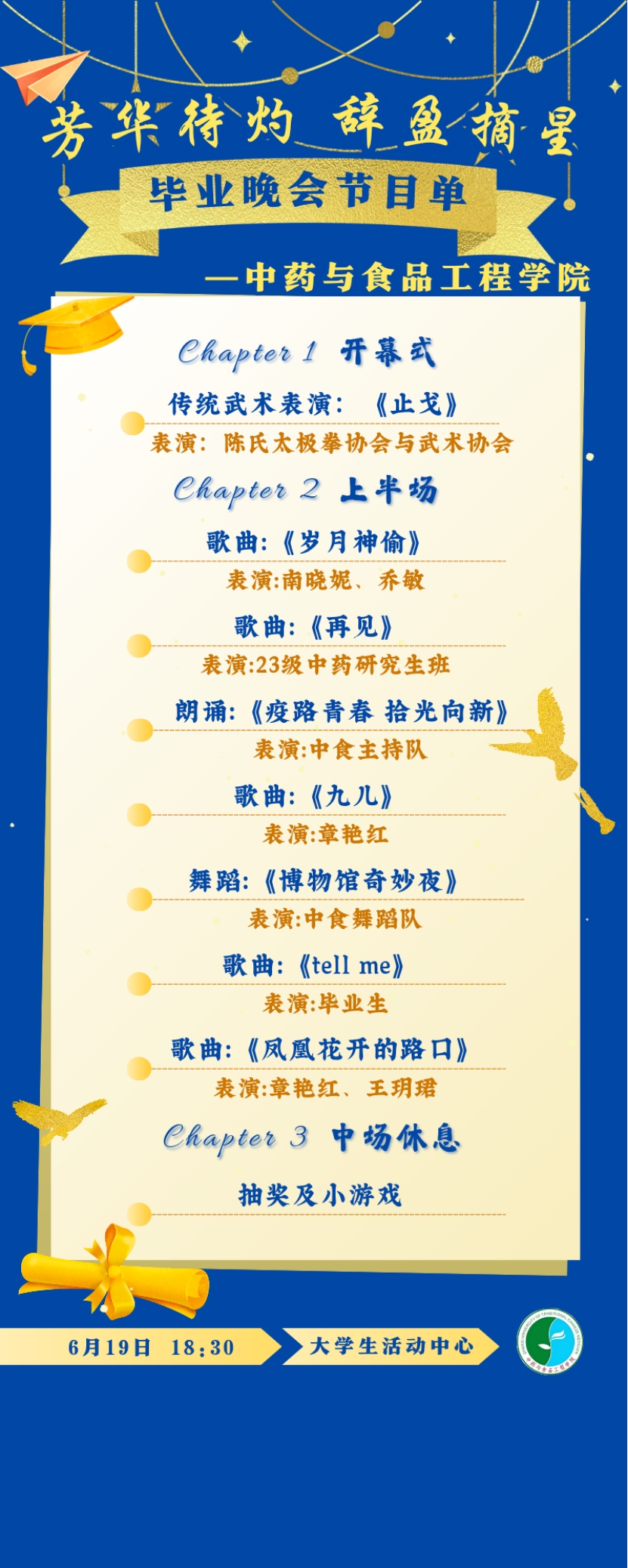 四年光阴,从本草典籍的墨香中走来,在实验室的光影里成长,于操场的落日下奔跑…… 山西中医药大学中药与食品工程学院 2025 届毕业生即将踏上新征程。为致敬这段满载药香与热血的青春,学院将于2025年6月19日举办 “辞盈摘星,芳华待灼” 毕业生主题晚会 ,用舞台复刻校园时光,以歌舞传递岐黄情深。