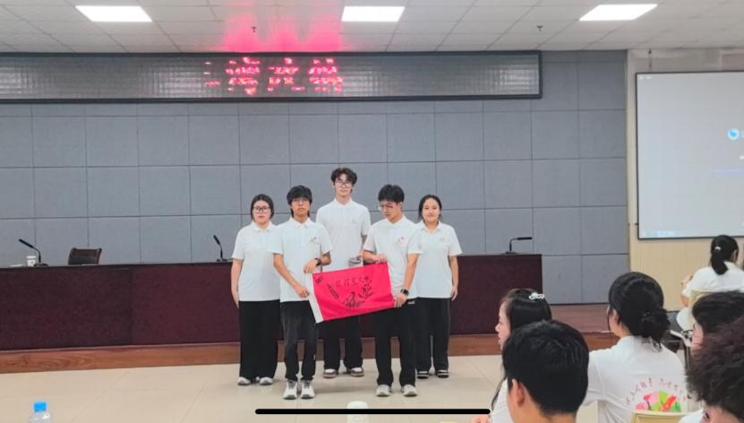 团队风采展示环节,我们用一场融合红色基因与专业特色的表演,诠释这份"协同之力"。《强军战歌》的激昂旋律响起时,我们列队上场,歌声里藏着对前辈的致敬,也透着青年的锐气。最让大家驻足的是我们的班旗——黑白勾勒的山峦是井冈山的剪影,沉甸甸的麦穗象征工农群众的坚实根基,旁边几株草药尤其醒目:"这藏着军民鱼水情的温暖;当年红军用草药救治伤员,如今我们要让中医药在新时代发光发热,就如我们口号中“草木承红韵,药香续井冈——用道地药材,讲百年风云!”。